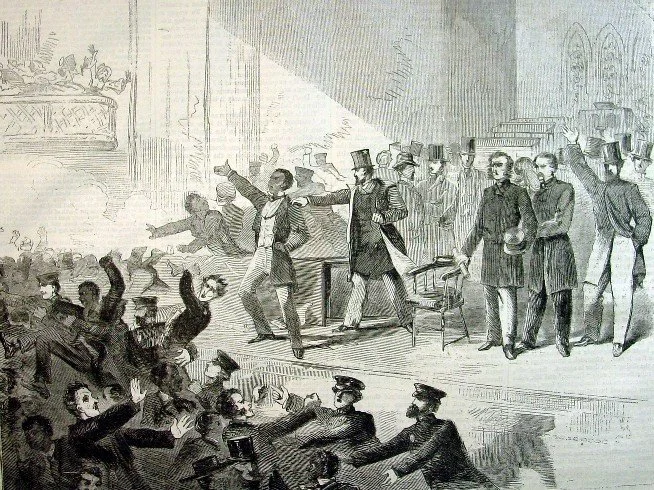 Frederick Douglass depicted (center) in "EXPULSION OF NEGROES AND ABOLITIONISTS FROM TREMONT TEMPLE, BOSTON, MASSACHUSETTS, ON DECEMBER 3, 1860" Winslow Homer Civil War Wood Engraving